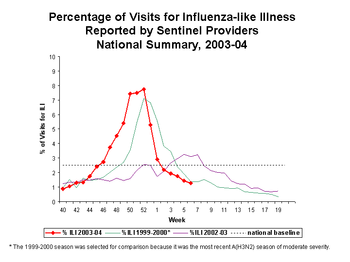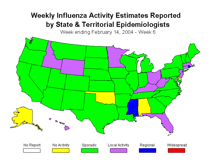 Influenza activity remained low during the week of February 8-14, 2004. The percentage of patient visits for influenza-like illness (ILI) remained below the national baseline (2,5 %). Mortality due to pneumonia and influenza (P&I) continued to decline (8,6 %), but remained above the epidemic threshold for week 6 (8,3 %). Twenty-seven (2 %) of 1 328 specimens collected from throughout the United States and tested by U.S. World Health Organization (WHO) and National Respiratory and Enteric Virus Surveillance System (NREVSS) collaborating laboratories were positive for influenza. There were no reports of widespread influenza activity from state and territorial epidemiologists during week 6. Two states reported regional activity, and 11 states reported local activity. Thirty-three states, New York City, the District of Columbia, and Guam, reported sporadic activity, and 4 states reported no activity.