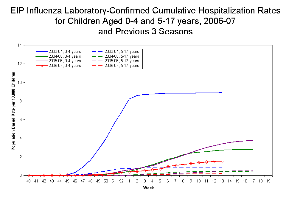During October 1, 2006 to March 31, 2007, the preliminary laboratory-confirmed influenza-associated hospitalization rate reported by the EIP for children 0-17 years old was 0.61 per 10,000. For children aged 0-4 years and 5-17 years, the rate was 1.54 per 10 000 and 0.21 per 10,000, respectively.