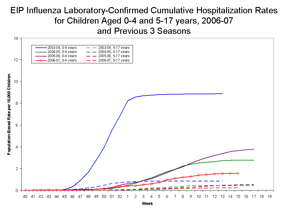 During October 1, 2006 to April 28, 2007, the preliminary laboratory-confirmed influenza-associated hospitalization rate reported by the EIP for children 0-17 years old was 0.81 per 10,000. For children aged 0-4 years and 5-17 years, the rate was 1.62 per 10 000 and 0.23 per 10,000, respectively.