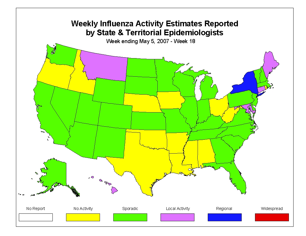 During week 18 (April 29 - May 5, 2007)*, influenza activity continued to decrease in the United States. Data from the U.S. World Health Organization (WHO) and National Respiratory and Enteric Virus Surveillance System (NREVSS) collaborating laboratories indicated a similar percentage of specimens testing positive for influenza during week 18 compared to week 17. The percentage of visits for ILI to sentinel providers decreased during week 18 and was below the national baseline for the seventh consecutive week. One state reported regional influenza activity; five states reported local influenza activity; the District of Columbia, New York City, and 31 states reported sporadic influenza activity; and 13 states reported no influenza activity. The number of jurisdictions reporting widespread or regional influenza activity decreased from three for week 17 to one for week 18. The percent of deaths due to pneumonia and influenza has remained below baseline levels for the entire influenza season to date.