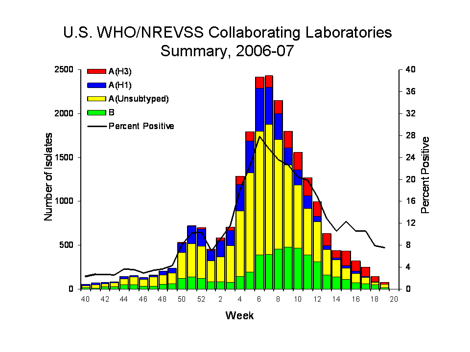 Since October 1, 2006, WHO and NREVSS laboratories have tested a total of 170 452 specimens for influenza viruses and 23 009 (13,5 %) were positive. Among the 23 009 influenza viruses, 18 256 (79,3 %) were influenza A viruses and 4 753 (20,7 %) were influenza B viruses. Six thousand thirty-five (33,1 %) of the 18 256 influenza A viruses have been subtyped: 3 847 (63,7 %) were influenza A (H1) viruses and 2 188 (36,3 %) were influenza A (H3) viruses. While influenza A (H1) viruses were predominant this season, overall influenza A (H3) viruses have been reported more frequently than influenza (H1) viruses since early March. Among specimens tested for influenza during the most recent three weeks (April 22 - May 12, 2007), on a regional basis, only the Mid-Atlantic, South Atlantic, and Pacific regions reported >10 % of specimens testing positive.