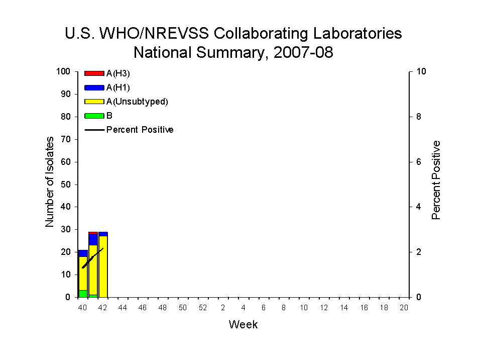 During week 42 (October 14-20, 2007), a low level of influenza activity was reported in the United States.- Twenty-nine (2,2 %) specimens tested by U.S. World Health Organization (WHO) and National Respiratory and Enteric Virus Surveillance System (NREVSS) collaborating laboratories were positive for influenza.